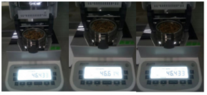 - 用實驗勺取3g酒糟(93/94)均勻鋪在樣品盤上,設置好合適的溫度后蓋下上蓋,按下“START”鍵開始測試;蜂鳴兩聲后,儀器自動停機,測試結束,可在液晶顯示屏查看測試后酒糟的水含量為46.433%;