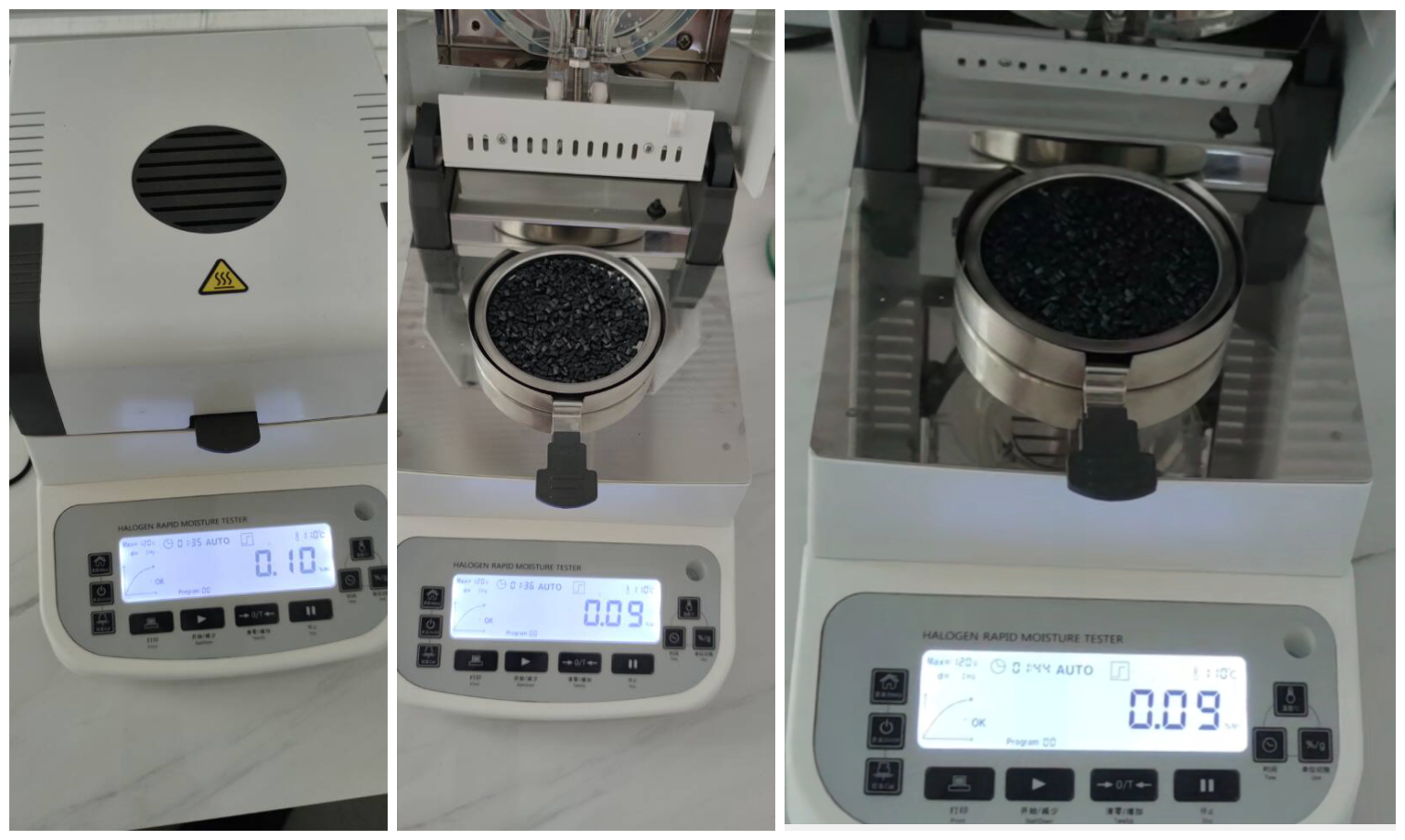 5. 復位儀器,待儀器冷卻至40℃以下后,再取15g左右樣品鋪在樣品盤上,重復上述測試步驟;測試結束后得出第三組數據,顯示樣品的水分含量為0.09%;數據基本相同,排除了一、二組測試的小概率巧合,確認測定結果準確。