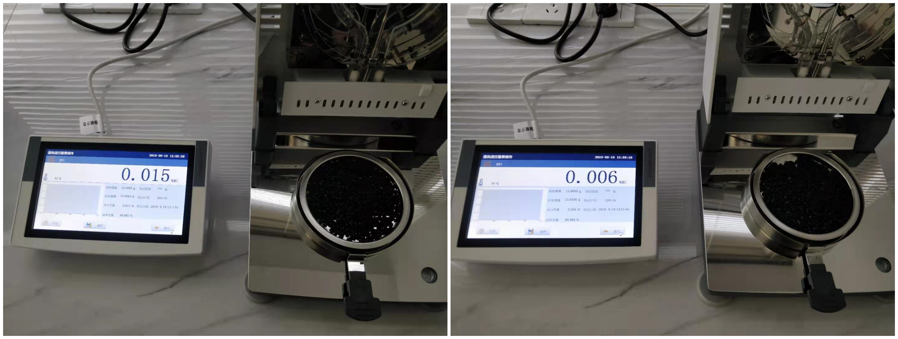 - 取15g左右待測(cè)粒子放入樣品盤,用實(shí)驗(yàn)勺掃勻,蓋下上蓋,啟動(dòng)程序,先進(jìn)行10分鐘的烘干處理;