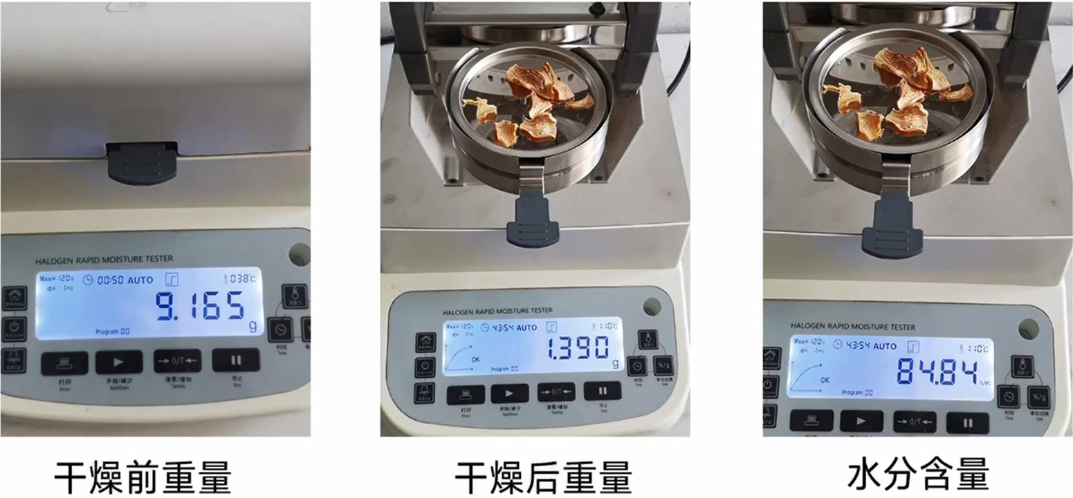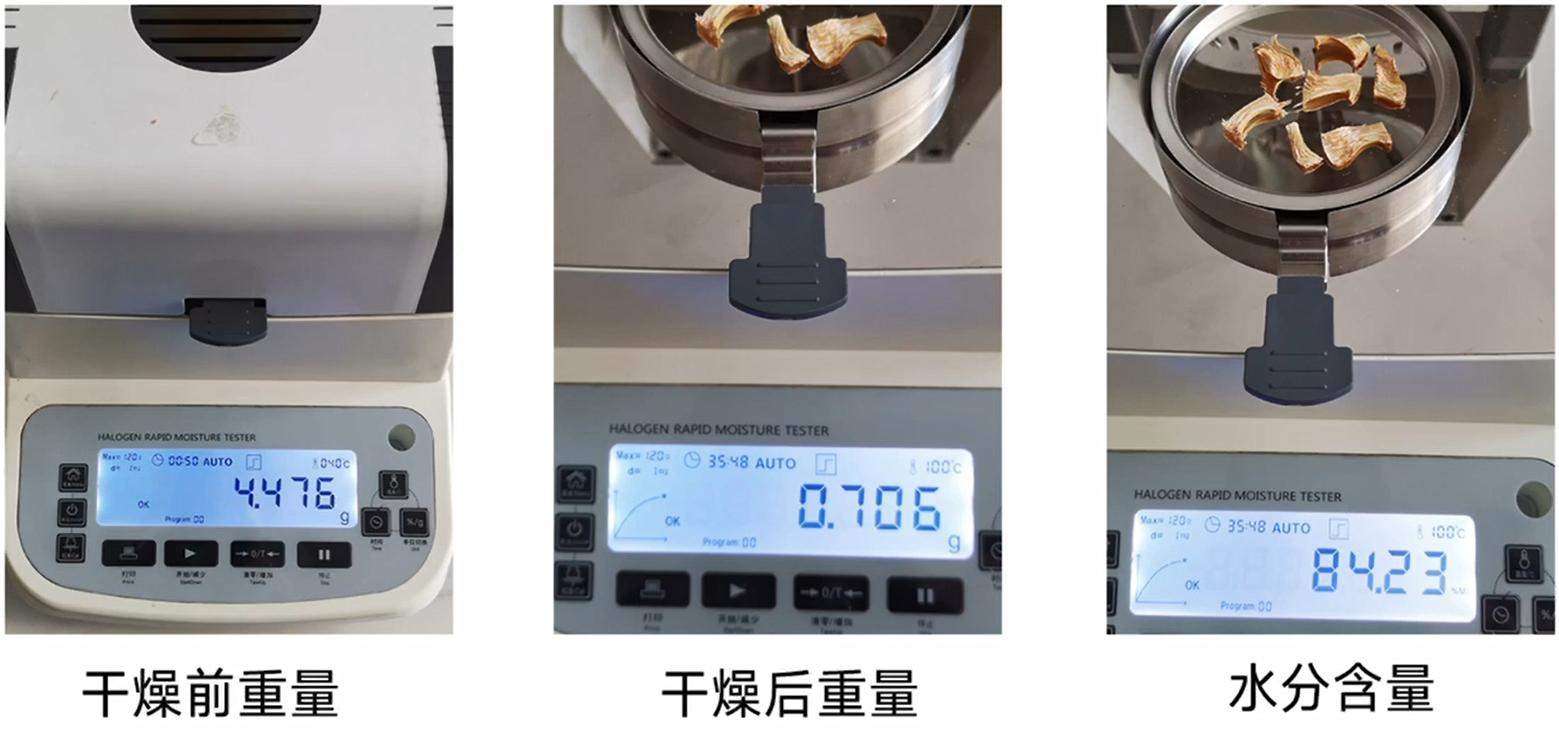 首先將測量溫度調整到100℃,然后將筍切成薄片,往樣品盤里加入3-5g的筍片,蓋上蓋子,等重量數值穩定后按開始鍵,儀器開始自動測量。